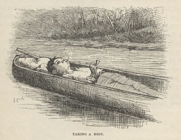 I roll out of the water and sit on the stone steps that rise from the poolside. There’s the bridge, and then the other, and further south the big buildings downtown. The river snakes north, the sky turns from light blue to dark blue to bruise-purple after the last of the pink and the orange. The yellow lights dangle in the grass and the trees, followed by the screech-screech-screech of crickets. Bats dart around the glow of the lampposts. It’s here where I wonder, frankly, God almighty, why am I doing this. What am I trying to prove, who am I attempting to disprove? It just feels silly. Better than being on my phone, I guess. But that’s not saying much. On the river the city ferries churn north. Police boats follow, with their blue and red lights. And then come these long, flat barges with nothing visible but a lone light or two. They look like rafts out there with little lanterns. The river, the lone boats, the nighttime. The realization is so sudden and simple that I get annoyed with myself. Stupid, silly man, I think. All this time I thought I had been doing something innocuous, fun, lighthearted, completely original. But it had all already been done before. I was trying to be baby Moses in the basket, yes, that’s that part of it. But the river, the lights, the steamboats, floating far far away. All that time I was preparing for Huck and Jim.